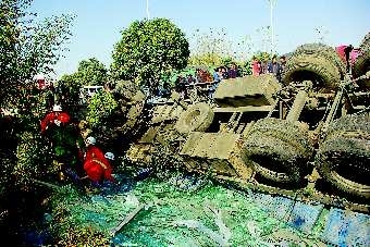 22日,滕州姜屯镇境内两车相撞,满载玻璃的大货车侧翻路边沟内,车上一名押车男子被埋压在破碎的玻璃下面。经过抢救,男子脱离危险。 赵慧 季龙 雪岩 摄影报道