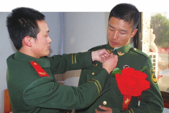 24日早上8时30分,武警东营支队举行了老兵退伍仪式,老兵都戴上了光荣花。据了解,每年的11月25日是老兵退伍的日子。武警东营支队近百名士兵将要告别军旅生涯,踏上返乡之路。图为战友们相互整理着装。