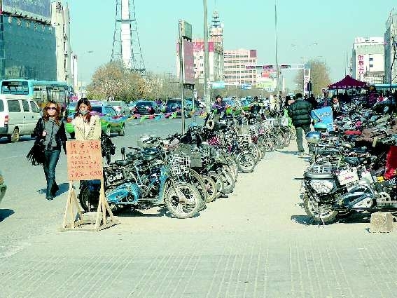 24日上午,记者来到济南路与西四路交叉口。在利群超市西门前的人行道上停了两排自行车、电动车,约50米长,还有两个看车人负责收费。记者看到虽然两排车中间有条小路,但是非常狭窄,很多行人只得走外边的马路。