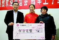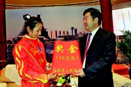 当日上午,日照市政府为王宁举行庆功会,市长赵效为将10万元“大红包”奖给了这个为家乡带来荣誉的23岁姑娘(上图)。下午岚山区区长徐淑利代表区委、区政府将5万元奖金颁给王宁(左图)。