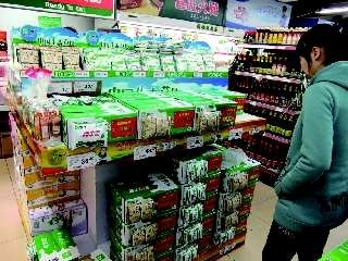 11月24日上午9点多,记者来到位于南大街上的大润发超市,发现牛奶销售区域成箱的牛奶堆积在一起,各种品牌、品种的牛奶一应俱全,促销牌上还写着它们的价格。