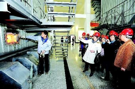 24日,省城举行“集中供热市民开放体验日”,在浆水泉热电厂的大锅炉前,市民们正在参观。