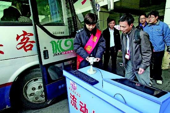 24日上午,在济宁汽车总站,乘客正在通过流动检票亭检票乘车。据了解,为迎接元旦客流高峰,车站专门购买了两台流动检票亭,客运繁忙时期乘客在停车场内直接通过流动检票亭检票乘车。 本报记者 张晓科 张建丽 摄