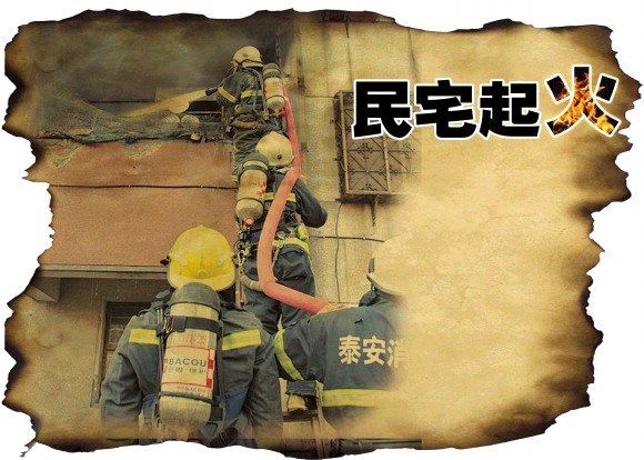 24日上午,泰城松园小区一居民家中突发大火。大火从厨房燃起,逐步蔓延至客厅和卧室。由于着火房屋内有6扇门12把锁,给消防队员入室灭火带来很多困难。图为消防队员正通过厨房外窗的缺口,向屋内喷水灭火。