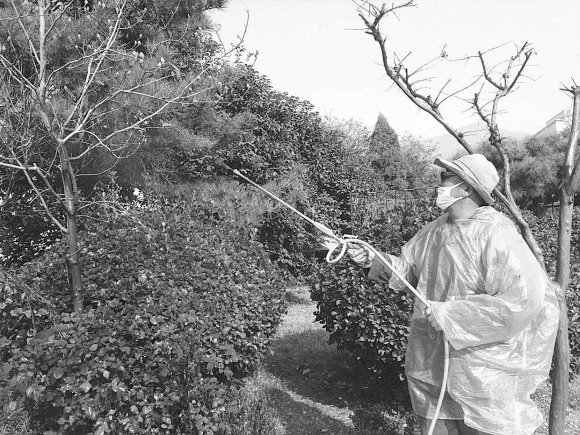 24日,在红门路附近,园林工人给树木喷洒石硫合剂。据了解,随着气温降低,许多害虫爬到树木的裂缝中过冬,涂抹这种合剂能杀虫、防病,确保树木健康生长。