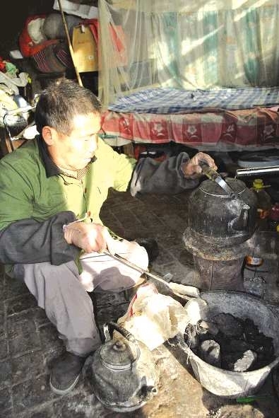 24日下午,记者来到徐家楼社区低保户胡宝军家中,他正在家门口帮人修鞋。四五位老人围着他坐着,一边晒太阳一边聊天。胡宝军告诉记者,为了今年过冬,他专门买了1000斤煤,但是现在还不敢烧,得等到天最冷的时候再烧。走进院内,记者看到胡宝军的老母亲正在屋门口晒太阳,她坐在轮椅上,穿着棉袄,腿上盖着棉被,屋门口安着一个小煤炭炉子,旁边的一个小木盒里盛着几块煤炭,炉子里没有生火。屋内有两张床,两张很矮的桌子,几个小板凳,一堆衣服堆放在墙角的几个纸箱里。“这两天暖和,没烧炉子,得等到天很冷时再烧。前一段时间很冷的时候,我们也只是在早晨和晚上才烧炉子,睡觉的时候再闷上。”胡宝军说。