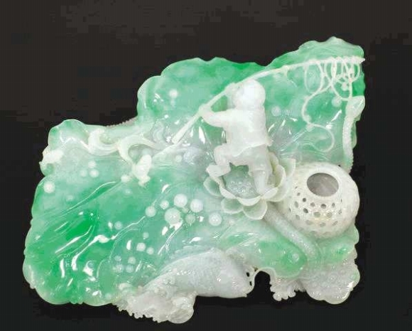 如图为七彩云南“天工奖”作品。“荷塘渔童”为天工奖金奖作品,作者充分利用石料颜色的变化,将民间吉祥物莲藕、荷花、鲤鱼、水珠、鱼篓、渔童等,巧妙地组合在一起,俨然一幅立体的山水画。天真烂漫的渔童站在荷叶船上撒网,网中蹦跳的鲤鱼栩栩如生、活灵活现,就连四溅的水珠也刻意雕成了跳动的珍珠。作者既打破了传统的手法,又不落俗套,将石料与雕技、自然与艺术完美地结合在一起。此作品在中国宝玉石协会“天工奖”评选上,获得众评委一致好评,获得金奖。“荷塘渔童”作品七彩云南于2005年售出,当时售价仅168万元,如今已成无价之宝。