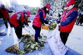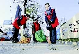 28日上午9时许,殷倩、李洋、耿倩、高忠伟、李胜男、翟雯婕6名赶到槐荫广场。一到广场,他们立即换上“百姓城管”的服装,拿起扫帚开始清扫落叶。记者听到殷倩的鼻音很重,一问才知她患了感冒,仍然坚持来进行路面清扫,为保洁员分担工作。