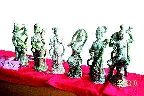 专家:你收藏的这几件是仿古人物造型“陶俑”,是用“模具”生产釉然后烧制、降温、出窑。这六个人物造型做得很好,取材于隋唐时期敦煌莫高窟壁画飞天“仙人共天乐俱行”中的奏乐、歌咏和舞蹈人物,每个人物手中都持有不同的乐器,有筝、箫、笛、胡琴、鼓、琵琶等,每个人物都神态怡然,仿佛深深陶醉在音乐之中,特别是这一件“反弹琵琶舞”(原造型在敦煌莫高窟中唐112窟),人物栩栩如生,它显示出敦煌艺术是在我国优秀民族传统的基础上吸收了外来文化的有益成分,经过千余年不断努力创造出来的,是具有时代风格和民族特色的艺术珍品。这几件“陶俑”造型值得喝彩,但遗憾的是它是现代大批生产的艺术品,尽管如此,它仍然具有艺术性、观赏性和收藏的价值,这6件“宝贝”大约在3000元左右。
