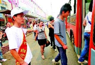 在临沂市区通达路一公交停车点,青年志愿者正在引导乘客们自觉排队。(资料片) 本报记者廖杰 摄
