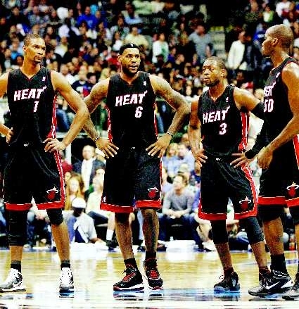 11月27日,热火队球员波什、詹姆斯、韦德和安东尼(从左至右)在比赛间隙。当日,在2010-2011赛季NBA常规赛中,迈阿密热火队客场以95:106负于达拉斯小牛队。 新华社发