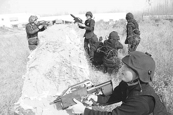 工作人员宣布开始后,“战事”一触即发。对垒双方之一的“匪”队员率先冲出战壕,在草丛、石墙的掩护下,紧握冲锋枪,直奔对面100多米远的“警”队阵地,开始进攻争夺阵地。“匪”队员顺利抢到3个石墙组成的阵地,可奇怪的是,本应同时抢夺阵地的“警”队员却踪影全无。2分钟后,抢夺阵地的侧翼突然响起猛烈的枪声—————“警”全体队员从两翼迂回包抄,奇袭“匪”。“哒哒”、“哒哒哒”……机枪声一阵紧过一阵,“匪”队员拼死抵抗,“警”拼命强攻。13分钟后,“反恐精英阵地战”结束,“警”将“匪”全部拿下,几名“匪”队队员由于中枪达30枪,无法开枪射击,宣告投降。