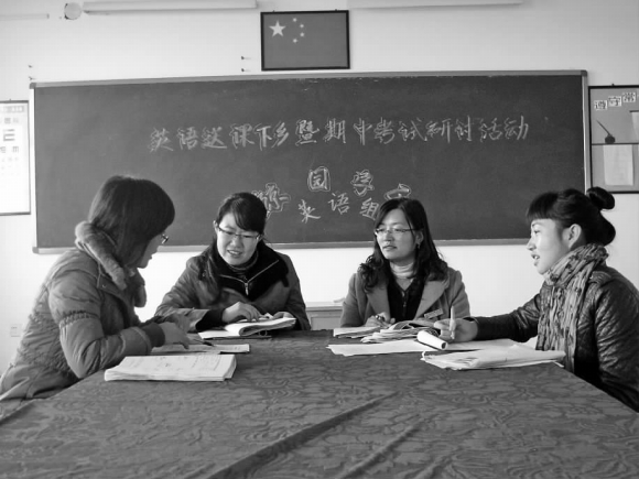 先进的教学方法带给桥头小学,分学科进行了细致有效的评课活动。图为两校教师