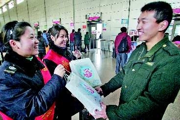 27日上午,在济宁汽车总站候车大厅,车站工作人员将精心准备的礼物送到退伍老兵手中。当日,车站迎来了不少退伍军人前来乘车,为纪念他们光荣退伍,车站特意准备了30余份礼物送给他们。本报记者张晓科张建丽摄