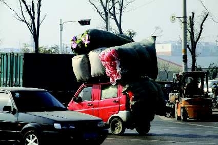 11月28日上午,在通达路南段,一辆三轮车载了五个“大包”摇摇晃晃地在路上行驶,非常危险。本报记者徐升 摄
