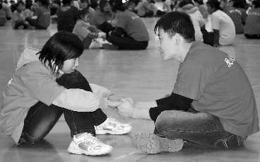 授技术)。图为受助学生与志愿者之间进行的“二人分享”心理疏导。 见习记者 张永斌 摄