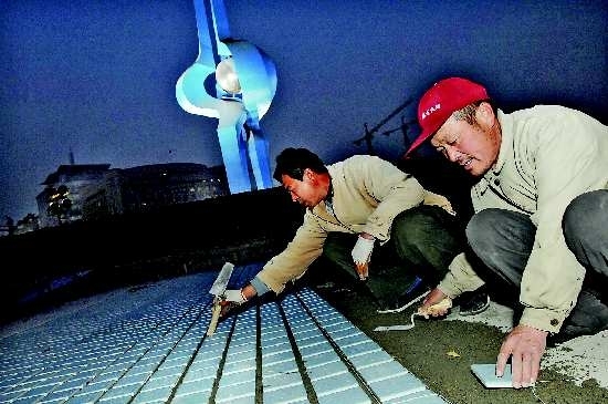 29日,泉城广场管理处开始对广场进行全面整修,这次整修投资近100万元,主要对广场的大理石地面、树穴及沉降处进行修缮。此次整修是“大客厅”12年来首次大规模的彻底整修。施工期间广场正常开放。图为29日晚,来自泰安的技术工人在泉标南侧铺设新的广场砖。 本报记者 陈文进 摄