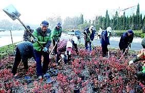 11月29日上午7时,园林工人在府前街与东三路交会处正把已经枯萎的花木铲掉。据悉,原先的花草已经枯萎,影响城市面貌,所以要重新种上抗冻的植物。