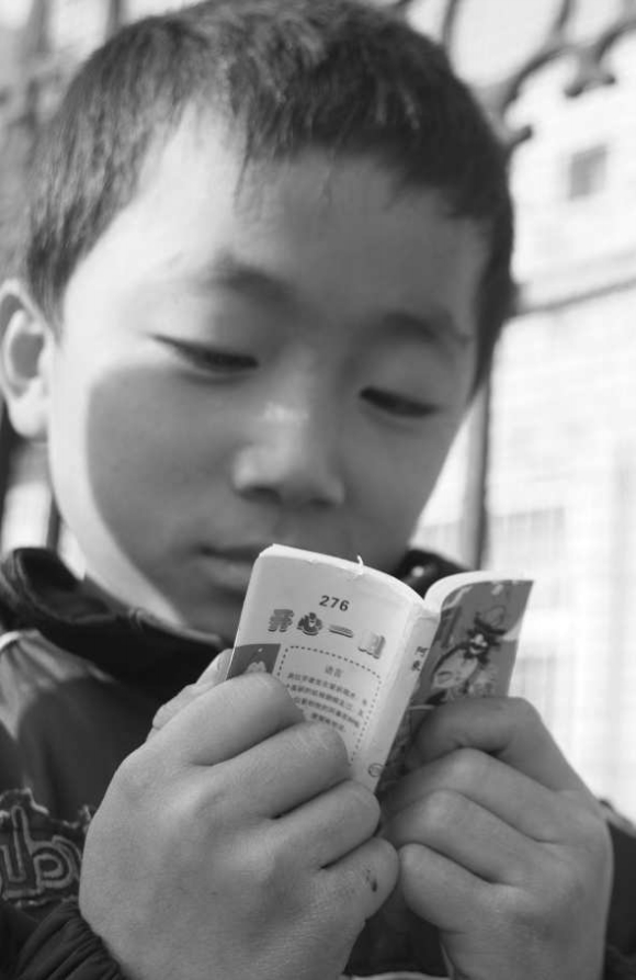 28日下午,在建设路小学门口,四年级学生小凯坐在花坛边上看漫画,这本漫画书仅有火柴盒大小。他使劲低着头,眼睛距离书仅不到5厘米,书上的字仅1毫米左右,很多图画和句子都看不清。“我一个同学买了100本这种漫画,我已经从他那里借阅了70本啦,很搞笑。”他说班里很多同学都买这种漫画看,也有同学上课时放在课桌下面偷偷看。