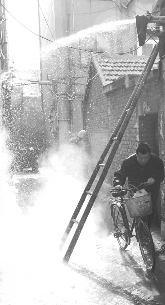 28日上午10点左右,记者赶到市质监局家属院时,看到从一座平房伸出的暖气管道正在往胡同里喷水,有居民小心翼翼地快速从水柱下面通过,胡同里已积了很多水。