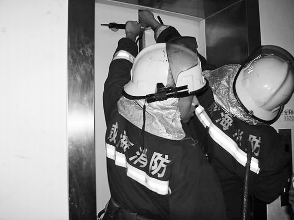 28日18时30分许,高区西涝台汇丰物流公寓的西侧电梯突然停止运行,一中年男子和一名小女孩被困在7楼位置的电梯内。消防四中队官兵赶至后,用撬棍将电梯撬开,两名被困人员安全脱险。 本报记者 陶相银 通讯员 胡增华 摄