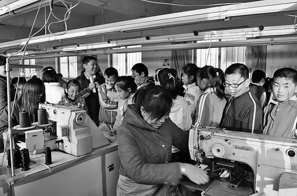 近日,荣成市府新小学组织学生到皮革厂参观。孩子们走出校门,走进工厂,体味劳动的意义。参观中,工厂生产过程分工合作的模式给孩子们留下深刻印象。图为参观现场。
