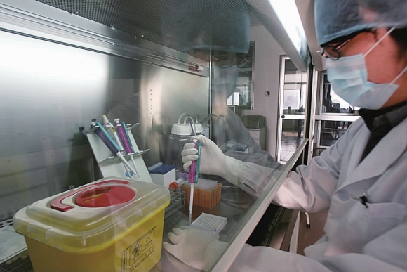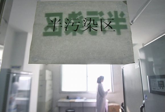 29日,在青岛市疾控中心6楼的检测室,一进大门,确证实验室主任赵国有指着门口一台显示着“-80℃”的冰箱说,-80℃是用来保存血样的,其他温度都不合适。再往里走,一位穿着白大褂、戴着口罩、帽子和橡胶手套的工作人员正在操作台上忙碌着。记者注意到,这个操作台和其他的不同,整个操作台被一个玻璃罩罩住,工作人员通过下面大约10厘米的空隙把手伸进去,对血样进行各种操作。“这个叫做生物安全柜,是为了保护工作人员的。”赵国有说,玻璃罩可以避免血液飞溅造成的传染,而且通过这个设备还能净化进入的气体,使空气过滤后才能排出来。