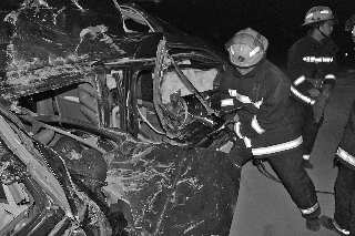 消防官兵赶到现场后发现,商务轿车右侧被拦腰撞上,整个车身严重变形,副驾驶座后面的一名乘客被变形的车门卡住,满脸鲜血,已无呼吸。拖挂货车侧翻在路边,驾驶员右腿被变形的车门和座位卡住,不时发出痛苦的呻吟声。