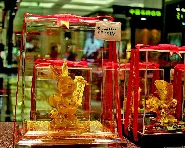 同时,记者在各大金饰专柜看到,兔年的贺岁金条也已经上柜,每克价格达到365元每克。另外,各种带着美好寓意的兔型镀金摆件也已经摆上各大柜台,等待市民的选购。