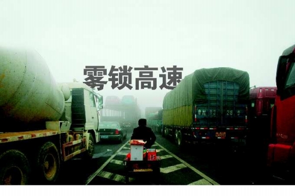 11月30日上午,大雾笼罩齐鲁,京沪高速公路德州收费站封闭,滞留车辆站外排起了长长的队伍,附近村民趁机向司机兜售食品。 本报记者 马志勇 摄