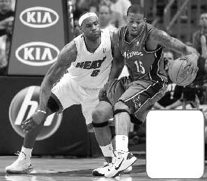 11月29日,热火队球员詹姆斯(左)在比赛中防守奇才队球员阿朗佐·基。当日,在2010-2011赛季NBA常规赛中,迈阿密热火队主场以105:94战胜华盛顿奇才队。