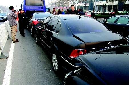 11月30日下午4点左右,在健康街和虞河路交叉路口西侧左转道上,四辆车连环追尾,所幸事故没有造成人员伤亡。据一位轿车司机介绍,当时最前面的蓝色中巴急刹车,由于后面的车辆刹车不及,最终导致四辆车连环相撞。 本报记者 吴凡 摄影报道