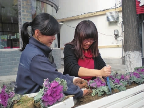 栽花相对复杂一些,从装花的卡车上搬下花,不同颜色的甘蓝放在不同的花槽中,把底部的塑料花盆扯开。用小铲子扒开土,把甘蓝放进凹槽里,用手把土填好。“用手填土更均匀。”徐师傅告诉记者。看似简单的动作,需要重复几万下。由于记者手法不娴熟,锋利的小铲子差点扎到左手。“习惯就好了。”因工作受过伤的园林工人小孙笑着向记者说道。
