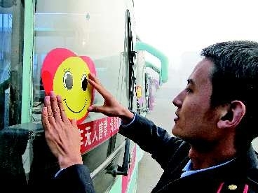 自12月1日起,德州市公共汽车公司将开展“温馨公交、微笑服务”活动,引导广大员工心怀微笑意识、常用文明言语。图为工作人员正在公交车前挡玻璃右下角位置粘贴笑脸标志。本报记者 李继远 摄影报道
