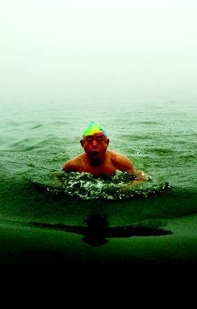 11月30日,在德州新湖,一名市民在雾中冬泳,将大雾甩在身后。