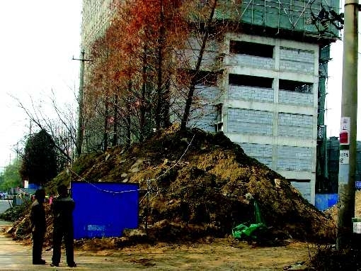 11月30日,荟阳路东侧6棵树龄十几年、价值过万的水杉树被土石方埋住,有的树干已经被毁坏。市园林局已通知开发商立即清理土石方,在不损坏水杉树的情况下回复原貌。 本报记者 赵波 摄影报道
