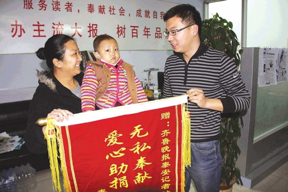 30日下午,王梅英女士左手抱着儿子旭旭,右手拿着一面写有“爱心捐助,无私奉献”的锦旗来到本报泰安记者站。王梅英说,送这面锦旗是为了感谢本报对旭旭病情的连续报道。捐款使得小旭旭渡过了危险期,顺利进入后续治疗阶段。