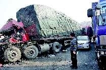江苏货车司机邱先生告诉记者,大约在8点左右,因为有雾,路上的能见度只有30米左右。他当时正在超车道上行驶,看见前面正常车道上行驶的一辆红色货车想往超车道上掉头,结果“哐当”一声就停住了,接着另一辆解放牌货车就冲到这辆红色货车的车底下去了。“当时就听见后面也‘哐当哐当’几声,接连发生追尾。
