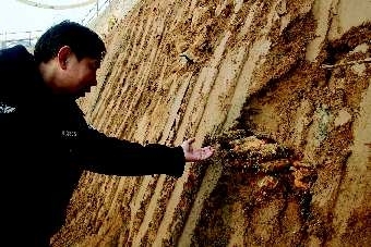 广场地基工程的坑壁上,一排排挖掘机履带印中,两排“可乐罐”十分醒目,它们整齐地“镶嵌”在坑壁上,离地一米多高。
