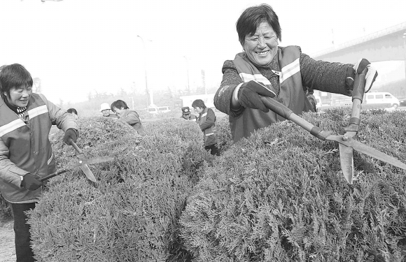 1日,泰安市园林管理局绿化二所的工人们在泰山大街、东岳大街绿化带,举行了一场由50名园林工人参加的园林技术比武大赛。评出了修剪、平整、缠绳等技术冠军。 本报记者 刘丽 摄