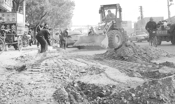 27日,灵山大街铁路涵洞工程竣工通车,泰安市环卫处对沿线施工遗留下来的土石、水泥堆等进行了拉网式清理。图为工作人员在灵山大街中段英雄山市场南首清理土石。
