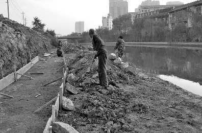 此次改造中,从东大寺桥至新塘子街段沿老运河东岸的952米部分,将修建上下3层的亲水平台,现已全面开工。在施工现场,项目经理李尚卿告诉记者,现有河岸线保持不动,二滩挡墙将拆除,新建将以蘑菇石为主,一滩挡墙浇注钢筋混凝土,外部挂贴蘑菇石面。运河路西侧人行道往西为绿化斜坡,斜坡下为1条宽3米左右的亲水步行道,并设置护栏、庭院灯等,护栏外便是3米左右的二滩,在老运河水位较低时,市民亦可从二滩上步行通过,二滩上每隔一段距离还可开挖部分树坑,栽植水生植物供市民欣赏。