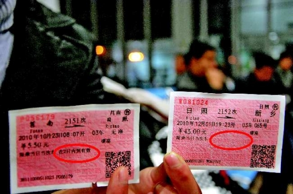 12月1日下午4时,一位乘客在日照火车站展示新旧火车票的不同。当日起,火车票正面的“在X日内到有效”字样被去掉。
