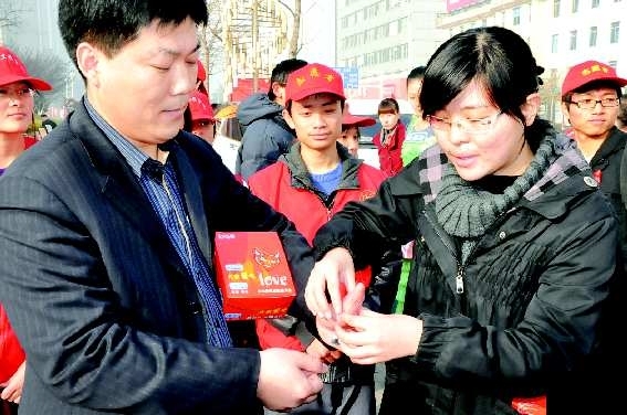 12月1日是“世界艾滋病日”,在烟台文化中心广场,市民李中正和一位女士演示安全套的正确用法。李中作为一名普通市民,从2002年12月1日的“世界艾滋病日”就开始在烟台各大广场免费发放安全套宣传防艾知识,整整坚持了9个年头。本报记者 赵金阳 刘新 摄