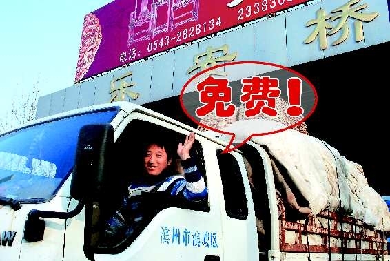 12月1日,从广饶运菜到滨州的张先生免费通过乐安桥收费站后,高兴地向记者挥了挥手。1日起,东营市所有收费公路为运输鲜活农产品车辆开通免费通道。(相关报道详见C02版)本报见习记者 任小杰 摄影报道