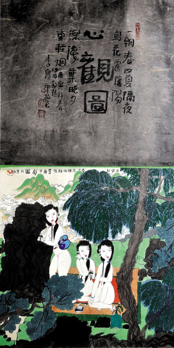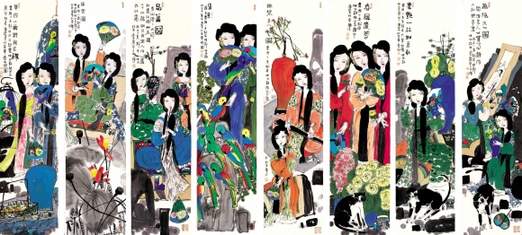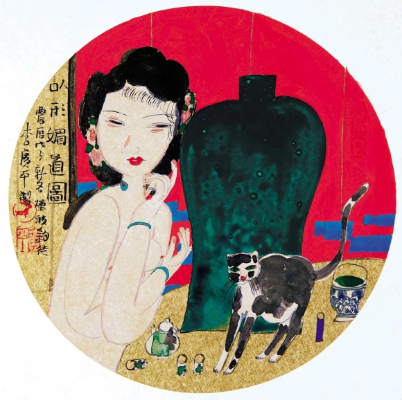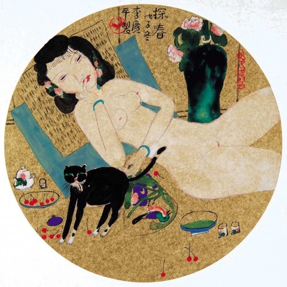 然近十年我的近作一改前风,多以仕女为题,设色堂皇富丽,妍厚姿媚,人物体态丰腴,慵懒娇憨,赏花、弈棋、观鸟、听琴、读书、风情万种,莫可名状。形态以裸体为表现,但古意盎然,只觉春风扑面,却无放荡淫邪。