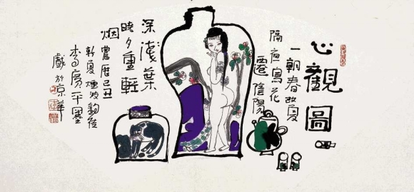 此一情境,乃梦中之境,却非现实之境。古今所作仕女者,多取其闲雅、为其赏目,足以悦人。我所作仕女却不避时风,近人性,究其然、显其境、通其用、悟其灵、小题却想大做。画以古法为宗,亦取时尚,无非尽善美于画帧,取境而舍法也。