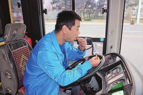 ③又要上路了,苗海平有些饿了,只能先吃点儿饼干点补点补。“晚饭只能等下班回家吃喽。”他笑着说。