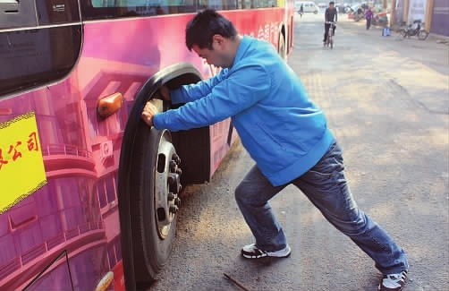 ②在到站休息的一小会儿时间里,苗海平还不忘检查车胎,防止纹理中有石子之类的东西。