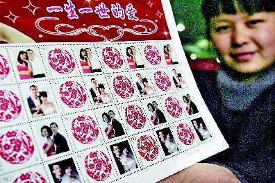 2日上午,在济宁市邮政局大厅,工作人员正在展示市民用自己的婚纱照做成的邮票。据了解,为了纪念和长时间保存,很多年轻市民把自己结婚照等纪念照搬上个性化邮票,这种个性化的定制业务也随之受到市民的欢迎。